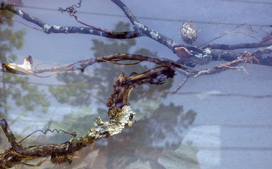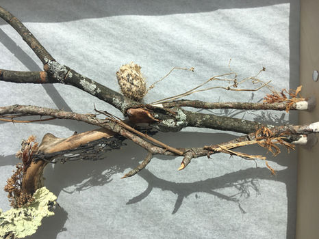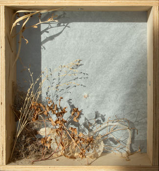 Half in Dream is a sculptural installation that bridges the gap between physical reality and the malleable shape of our perception. Situated on the border of the human and more-than-human, the sculpture offers a three-dimensional collage of collected natural ephemera from the outside looking in, and a two-dimensional projection of light and shadow from the inside looking out. The image formed is shifted through minutes and hours by the light of the star that propels all life, and by the turning of the earth that is our home. Night viewing brings an entirely different experience. It is never the same piece twice.